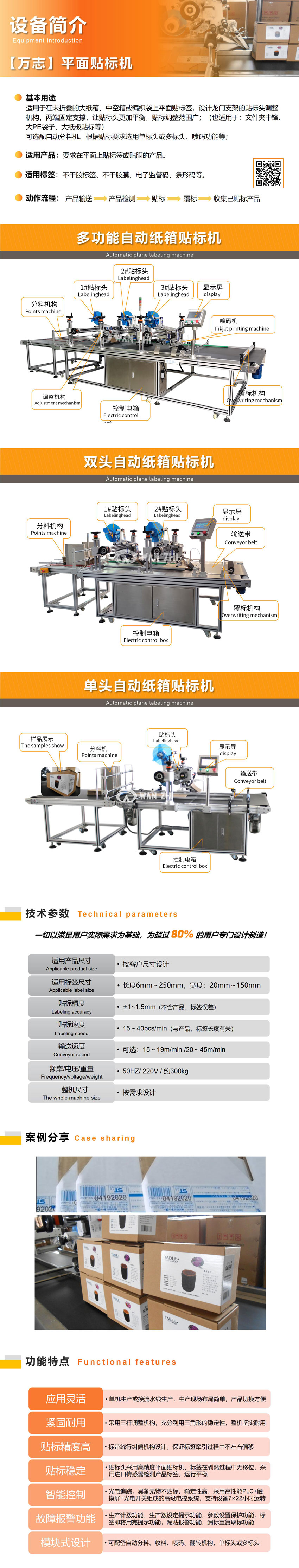 全自動紙箱貼標機適用于在未折疊的大紙箱、中空箱或編織袋上平面貼不干膠標簽,設計龍門支架的貼標頭調整機構,兩端固定支撐,讓貼標頭更加平衡,貼標調整范圍廣,最大范圍到寬度為800mm紙箱;可根據貼標要求做單標頭、雙標頭或多標頭;可根據用戶需求配備自動分料機構、收料機構、翻轉機構。(可同時應用于:文件夾中鋒貼標、大PE袋子貼標、大紙板貼標等)。