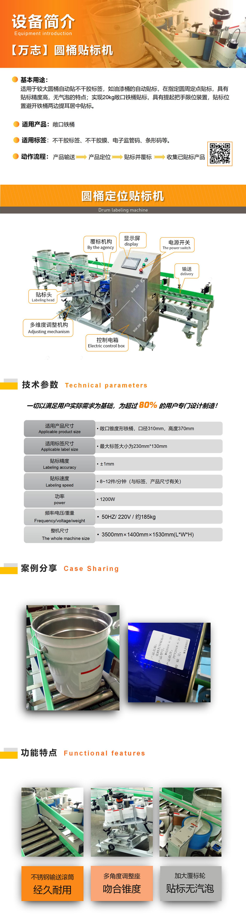 全自動油漆桶貼標機適用于油漆桶的自動貼標,圓周定點貼標,具有貼標精度高,無氣泡的特點;實現(xiàn)20kg敞口鐵桶貼標,可實現(xiàn)定位貼標,具有提起把手限位裝置,貼標位置避開鐵桶兩邊提耳居中貼標。