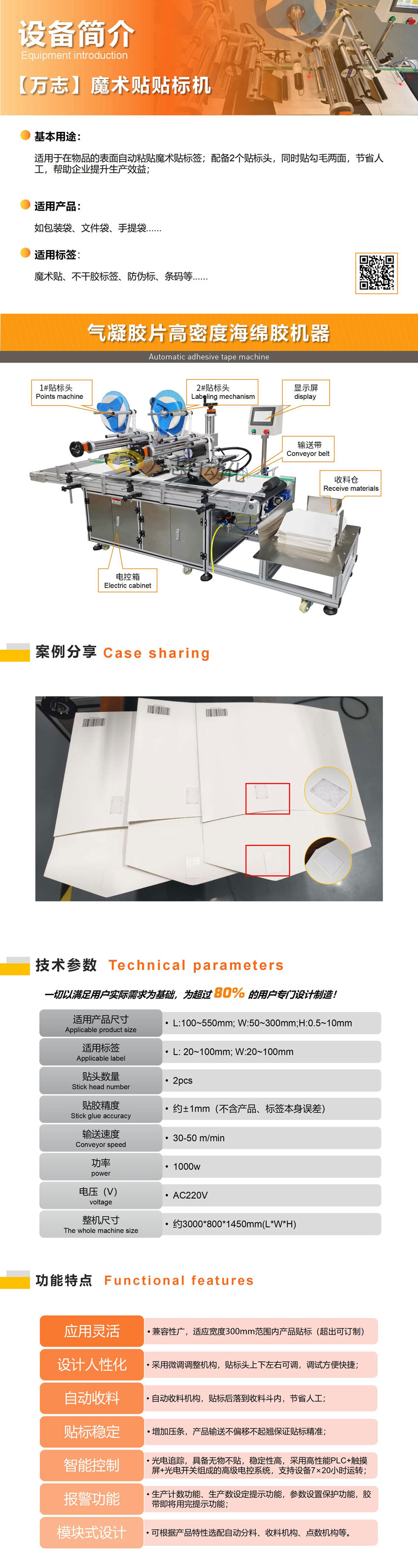 包裝盒自動貼魔術(shù)貼標簽機器適用于在包裝袋/盒或禮盒手提袋上自動粘貼魔術(shù)貼,勾毛兩面同時貼標;