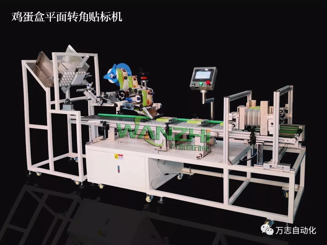 適用于產(chǎn)品的上平面貼標,如雞蛋盒、藥盒等方形產(chǎn)品上平面及拐角貼標;機械手自動取盒送到輸送上進行貼標后自動收集產(chǎn)品,本案例為雞蛋盒貼標,性能穩(wěn)定,大大提高生產(chǎn)效率;