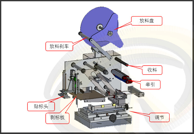 自動啟動——>人工放料 ——>1#標頭攔停產品貼標——>180度自動翻轉產品——>2#標頭攔停產品貼標——>產品堆疊——>推送推疊產品——>人工收料。