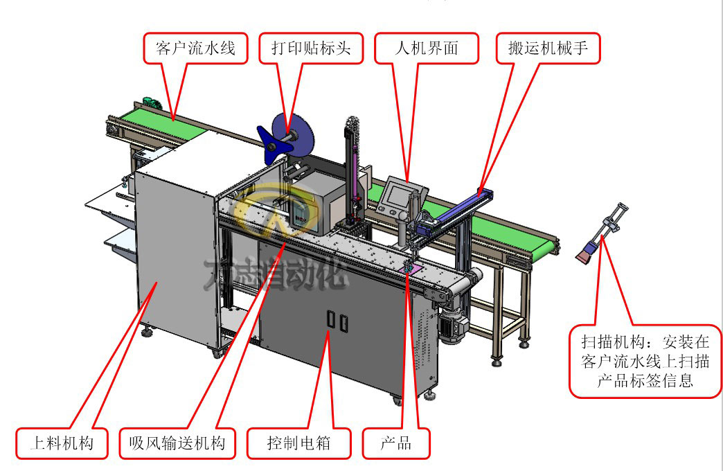 3.掃描槍掃描信息并傳回電腦,打印機(jī)打印標(biāo)簽,吸頭吸取標(biāo)簽;傳感器檢測(cè)到產(chǎn)品到達(dá)貼標(biāo)位,貼標(biāo)機(jī)械手進(jìn)行貼標(biāo)