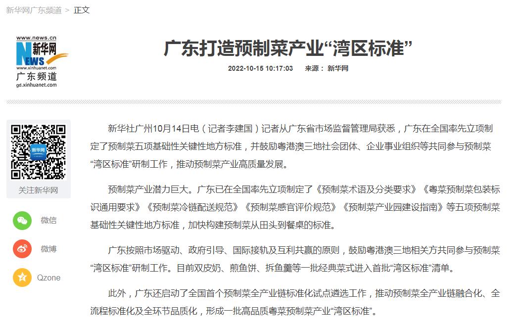 近日,廣東在全國率先立項制定預制菜五項基礎性關鍵性地方標準,包括《預制菜術語及分類要求》《粵菜預制菜包裝標識通用要求》《預制菜冷鏈配送規范》《預制菜感官評價規范》《預制菜產業園建設指南》等,加快構建預制菜從田頭到餐桌的標準。