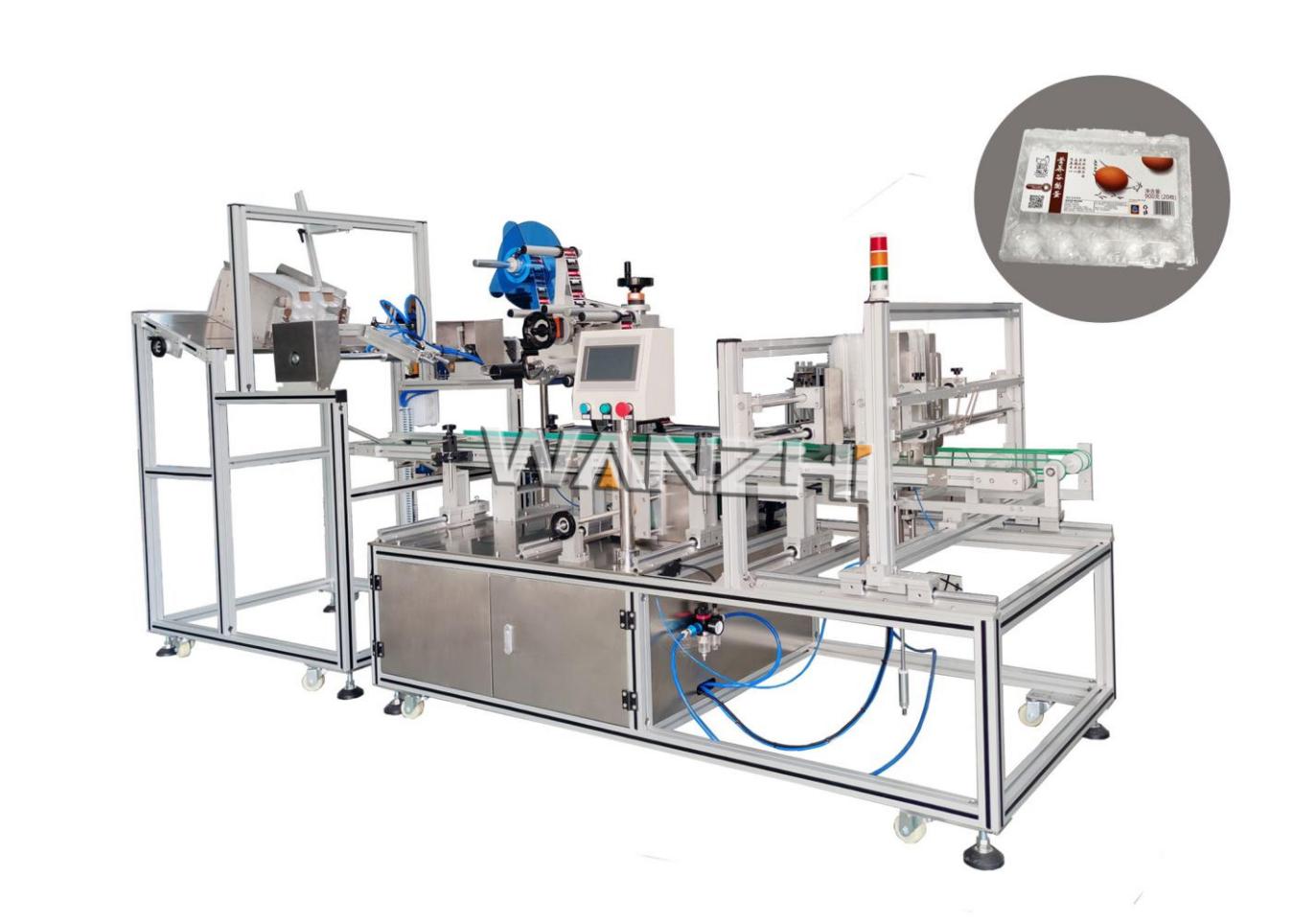 適用于吸塑包裝盒表面貼標,如水果盒、雞蛋盒等;機械手自動取盒送到輸送上進行貼標后自動收集產品,性能穩定生產效率1200~2300件/小時;可單機使用,也可與前端注塑機連接使用。