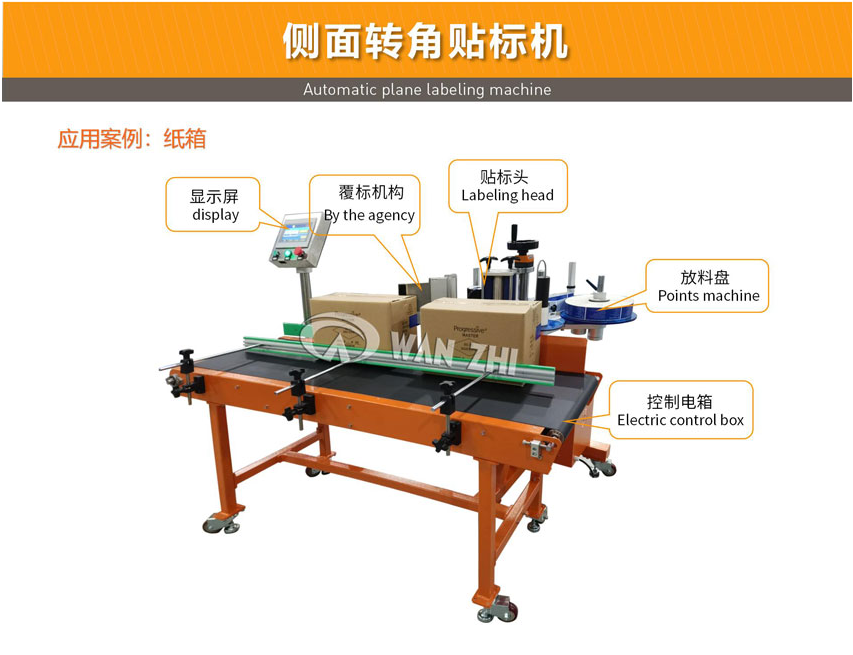 全自動側面轉角貼標機適用于包裝盒側面90度轉角貼封口標或防偽標,轉角機構可單獨停止,同時可適用于產品平面貼標;實現一般的上平面或轉角貼標;